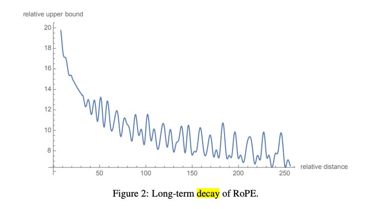 It took me a while to grok the concept of positional encoding/embeddings in transformer attention modules. In a nutshell, the positional encodings retain information about the position of the two tokens (typically represented as the query and key token) that are being compared in the attention process. Without this information, the transformer has no way to know how one token in the context is different from another exact token in the same context. For example: if abxcdexf is the context, where each letter is a token, there is no way for the model to distinguish between the first x and the second x. For a good summary of the different kinds of positional encodings, please see this excellent review. In general, positional embeddings capture absolute or relative positions, and can be parametric (trainable parameters trained along with other model parameters) or functional (not-trainable). A key feature of the traditional position encodings is the decay in inner product between any two positions as the distance between them increases. See figure below from the original RoFormer paper by Su et al.
