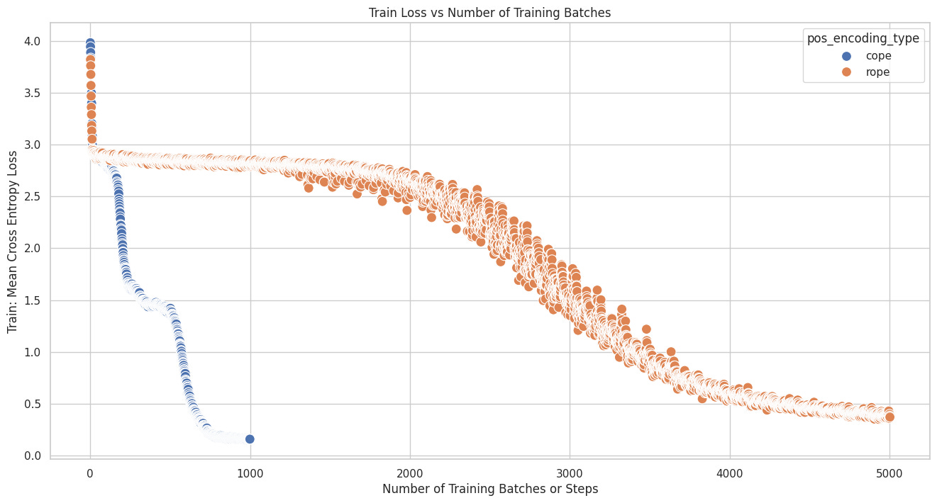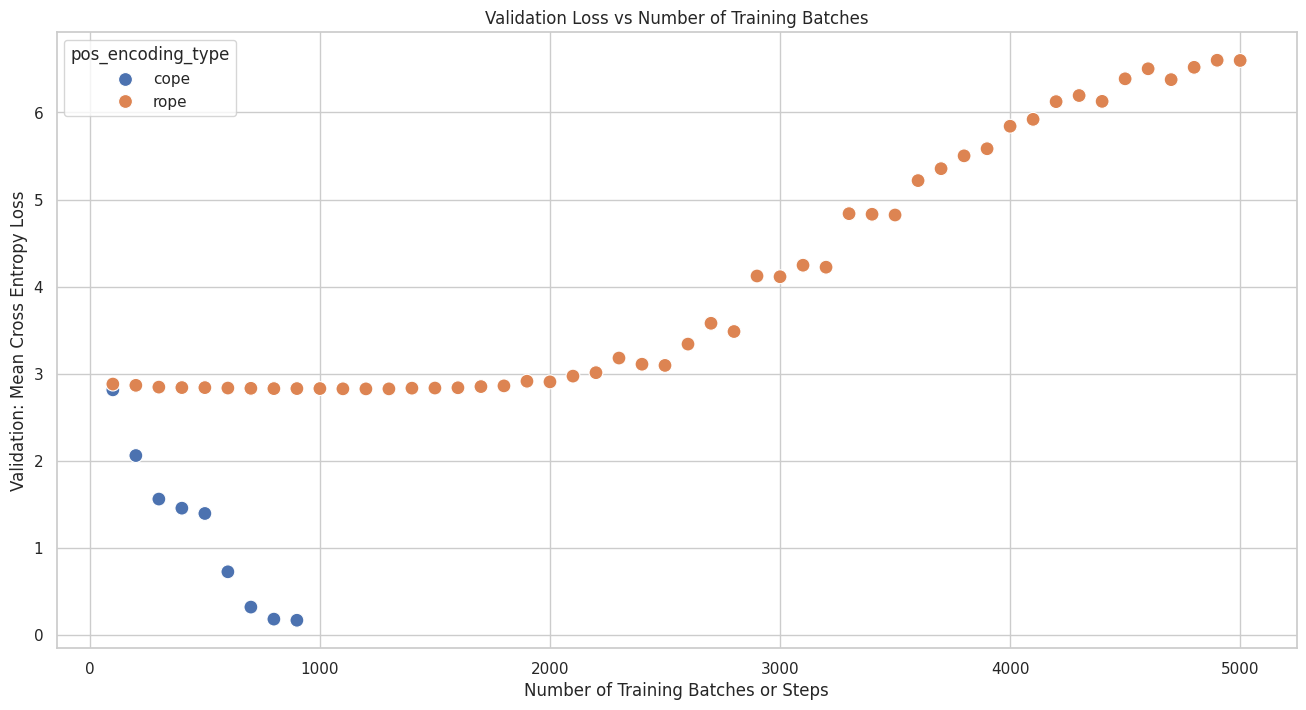 The following two plots show the mean cross-entropy loss for training and validation, respectively. What is interesting is that the amount of time taken to train is reduced when using CoPE and also the validation loss is much better. One obvious reason is that I’ve implemented CoPE parameters for each head separately within a transformer block which are extra learnable parameters that can help with the training process. Having said that, I am still surprised at how good these results are. Stay tuned as I play with this more in the next couple of weeks